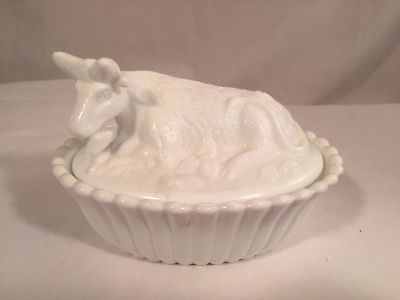 Milk Glass 2 Pc Cow on Ribbed Base Covered Dish