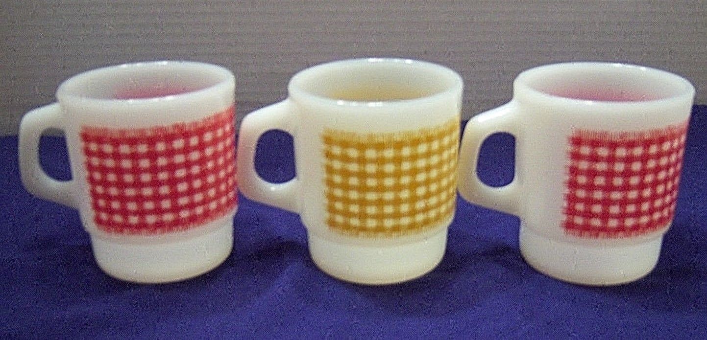 Title (ebay affiliate link): Set Of 3 Vintage Fire-King Red & Yellow Gingham, Plaid Milk Glass Mug Cup