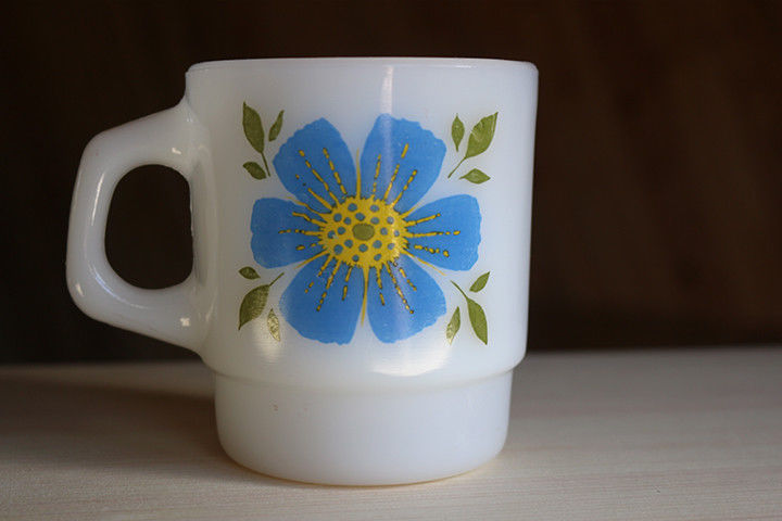 Title (ebay affiliate link): Vintage Fire King Milk Glass Blue & Yellow Flower Coffee Cup Stacking Mug