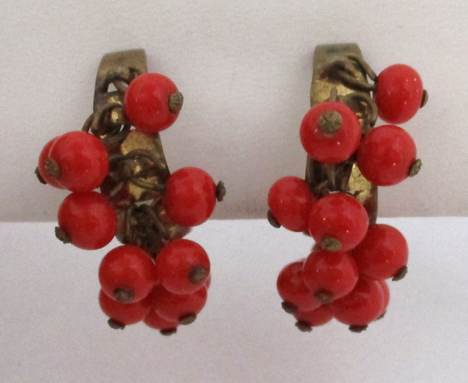 Vintage Dangling Cherry-Red Milk Glass Bead Hoop Earrings