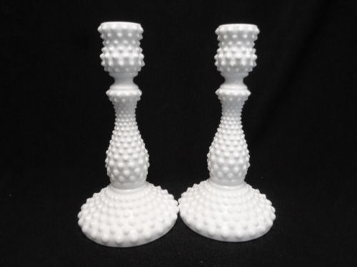 FENTON MILK GLASS HOBNAIL 9" PAIR OF CANDLESTICKS