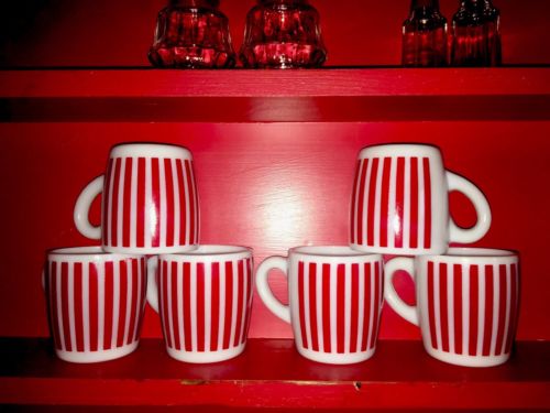 Title (ebay affiliate link): 6 VTG HAZEL ATLAS RED CANDY STRIPE MILK GLASS COFFEE MUGS CUPS DECO NOS Mint!