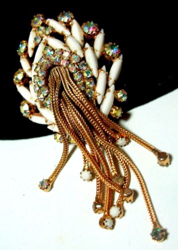 Title (ebay affiliate link): VTg STUNNING* RARE* JULIANA white MILK GLASS AB RHINESTONE DANGLE BROOCH PIN