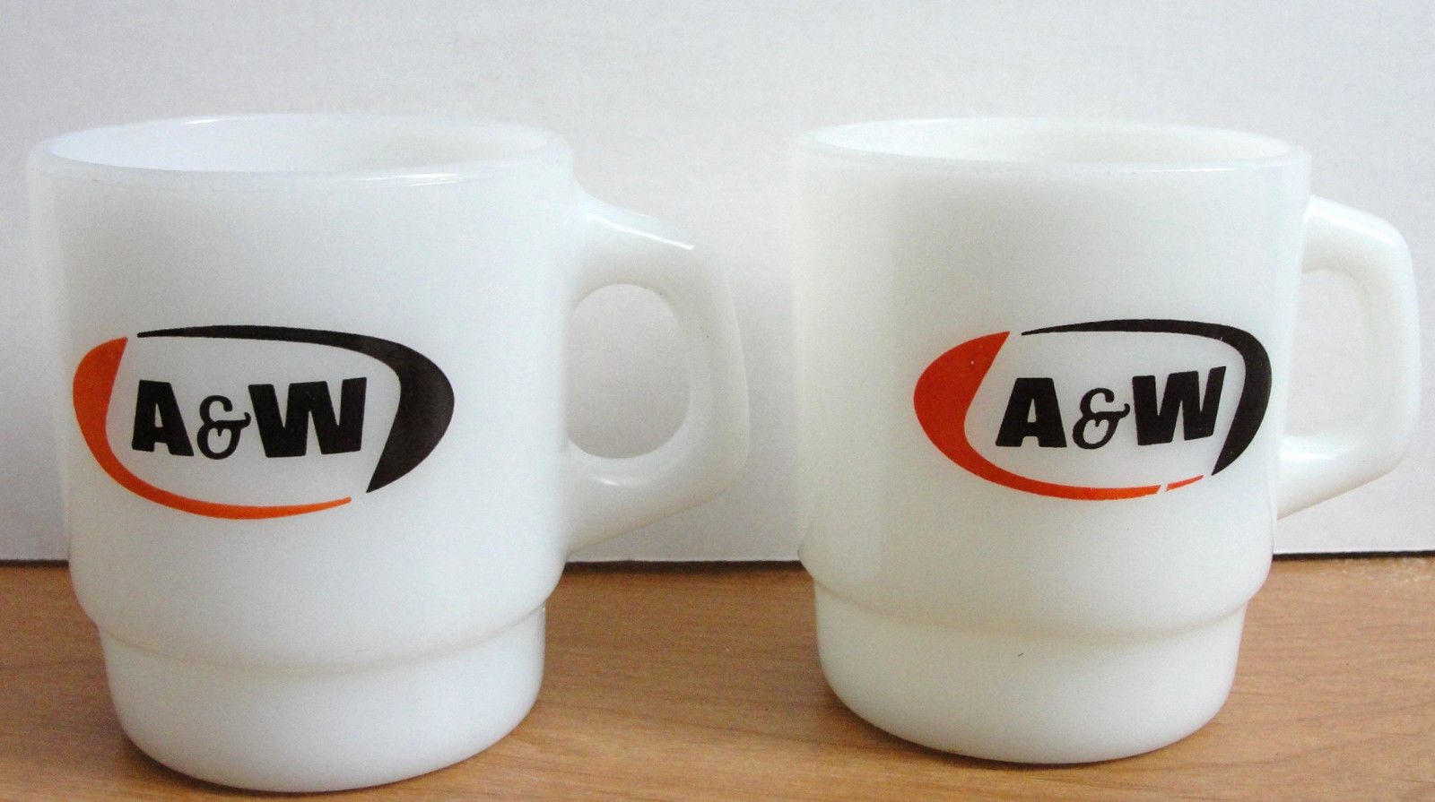 Title (ebay affiliate link): 2 x Vintage A&W Milk Glass Stacking Coffee Mugs Anchor Hocking Fire King