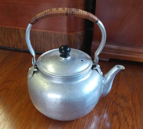 Title (ebay affiliate link): Vintage Aluminum Tea Pot with a Woven Rattan Handle and cute black knob top