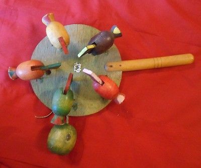 Title (ebay affiliate link): VTG Handmade Toy Chickens Hens Pecking Feed Wood Paddle Game String wooden toy