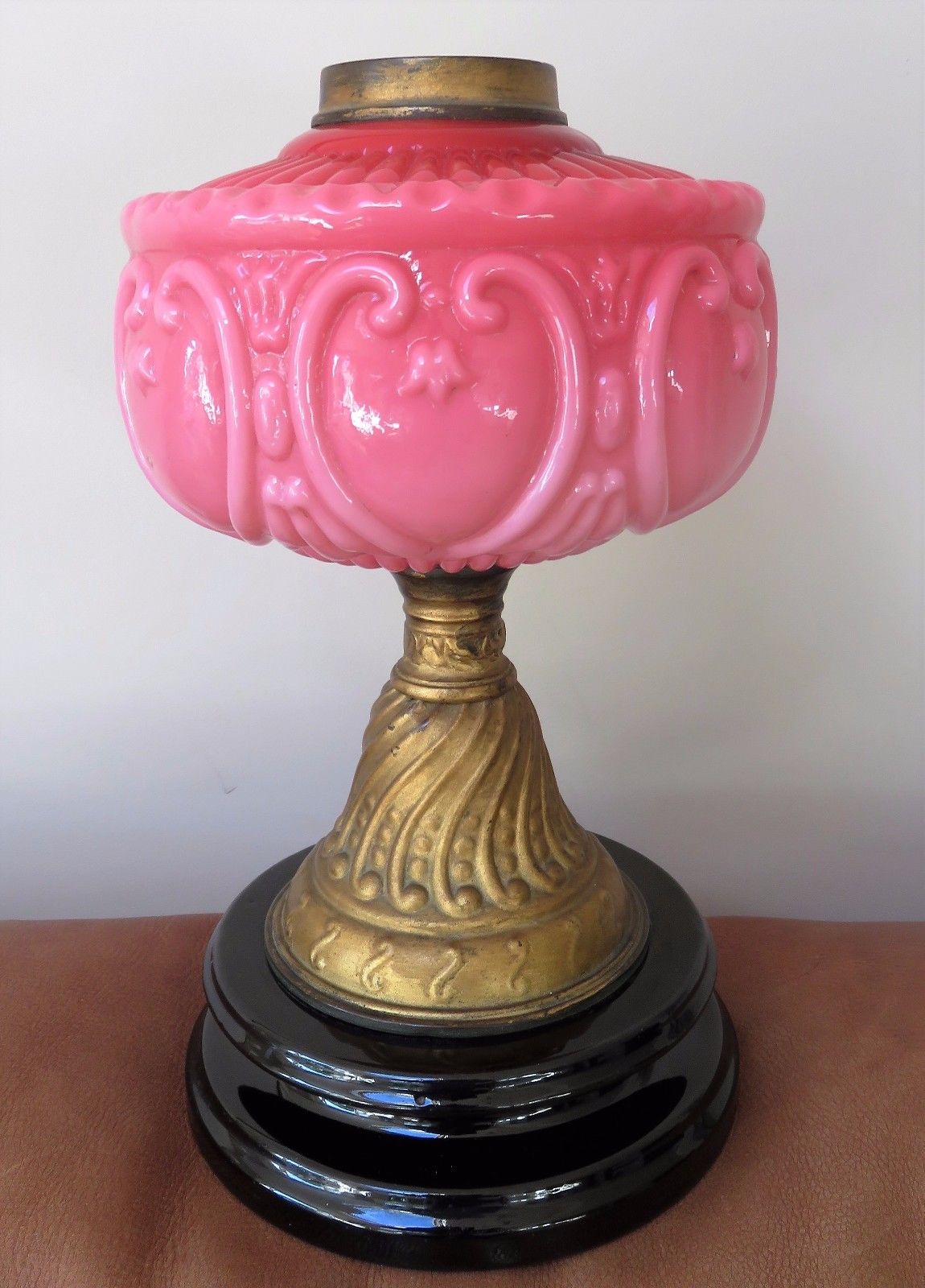 Title (ebay affiliate link): Antique Embossed Cranberry Opaque Glass Oil Lamp Font, Black Ceramic Base.