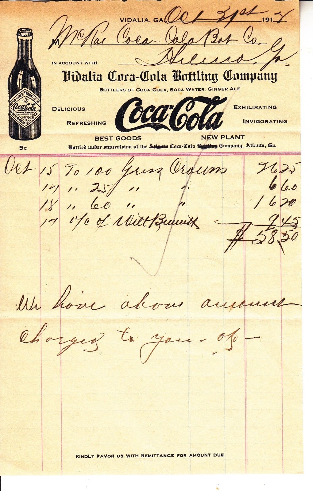 Title (ebay affiliate link): THE VADALIA COCA-COLA BOTTLING CO. INVOICE . DATED Oct. 21st, 1912