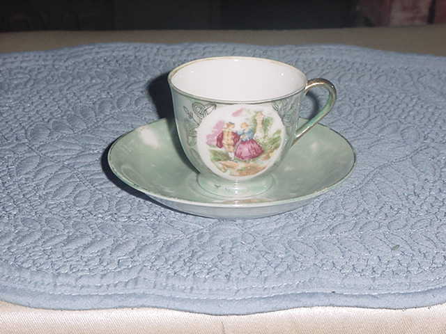 Soft Green Victorian Couple Vintage Teacup With Saucer Marked Japan in Red on