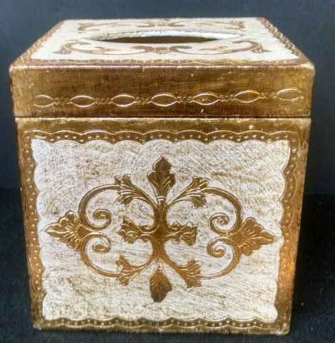 Title (ebay affiliate link): Vtg Off White Gold Italian Florentine Tole Wood Cube Kleenex Tissue Vanity Box