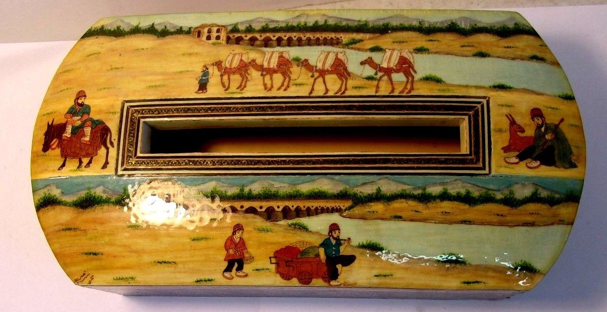 Title (ebay affiliate link): Handmade Marquetry Inlaid Mosaic Wooden Tissue Box Camel Scene Signed