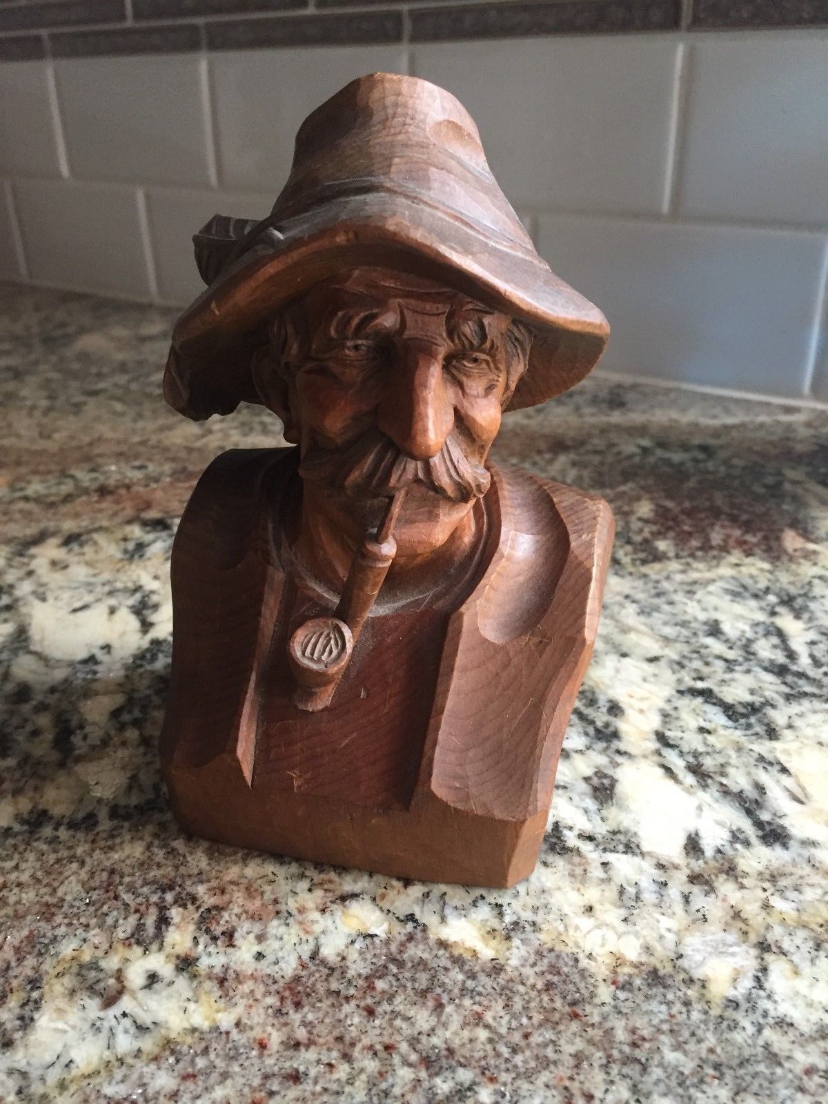 Old hand carved wooden figure of old man, pipe and hat