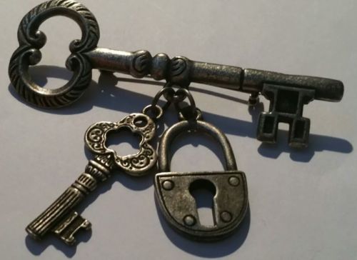 Title (ebay affiliate link): Vintage 1940s large silver tone keys & padlock brooch. Costume jewellery