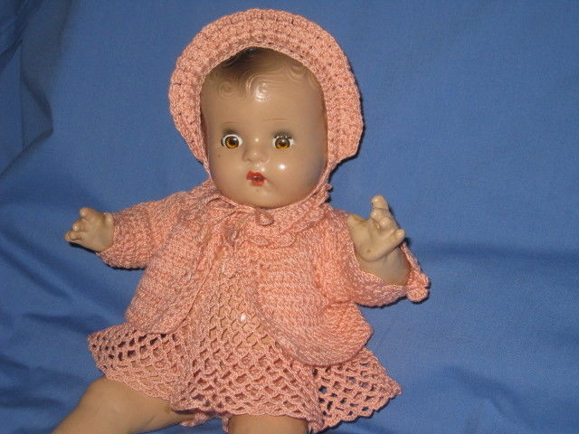 Vtg / Antique 14" COMPOSITION DOLL Sleep Eyes Teeth MOLDED HAIR CROCHET OUTFIT