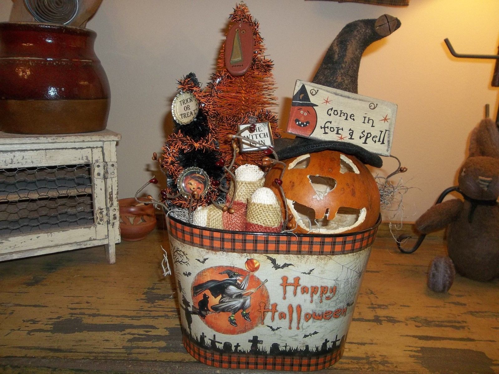 Title (ebay affiliate link): PRIMITIVE HAPPY HALLOWEEN DRIED GOURD HALLOWEEN BUCKET ARRANGEMENT