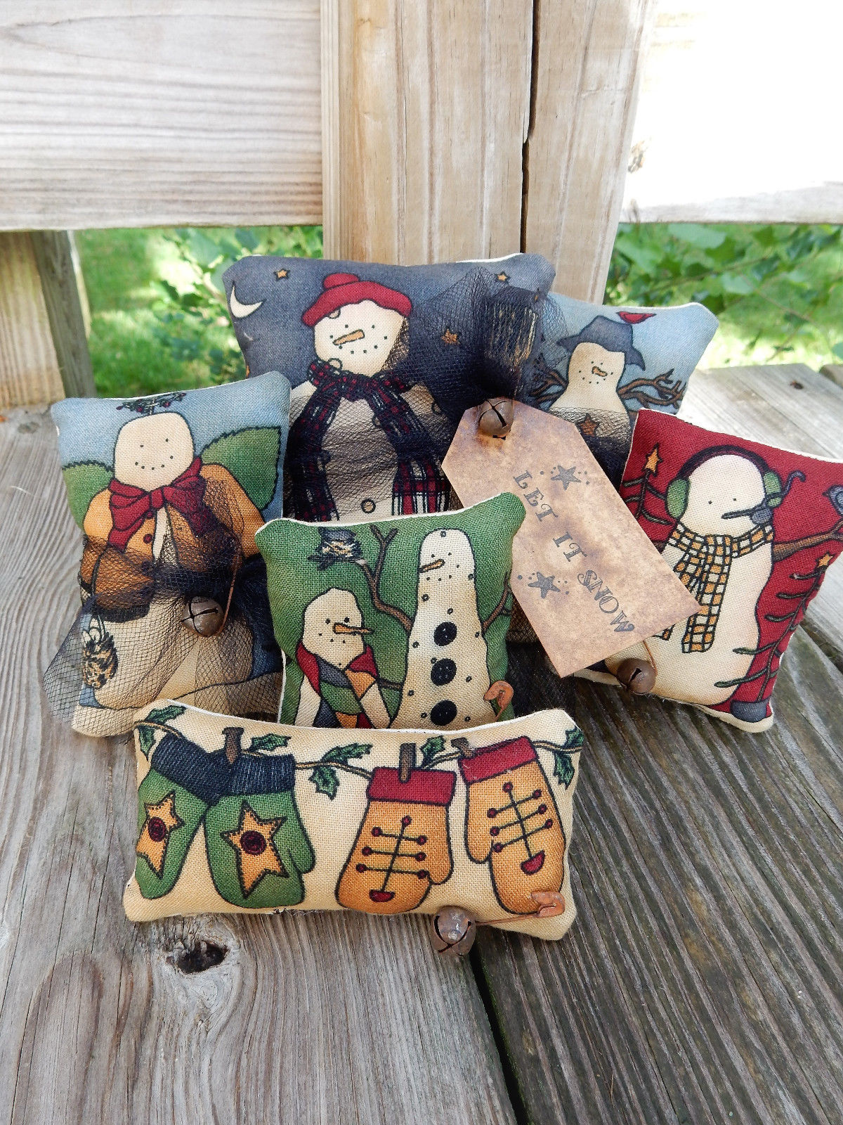 Title (ebay affiliate link): FoLk Art Primitive Christmas SNOWMAN mini PILLOWS Cupboard BasKet Bowl FILLERS