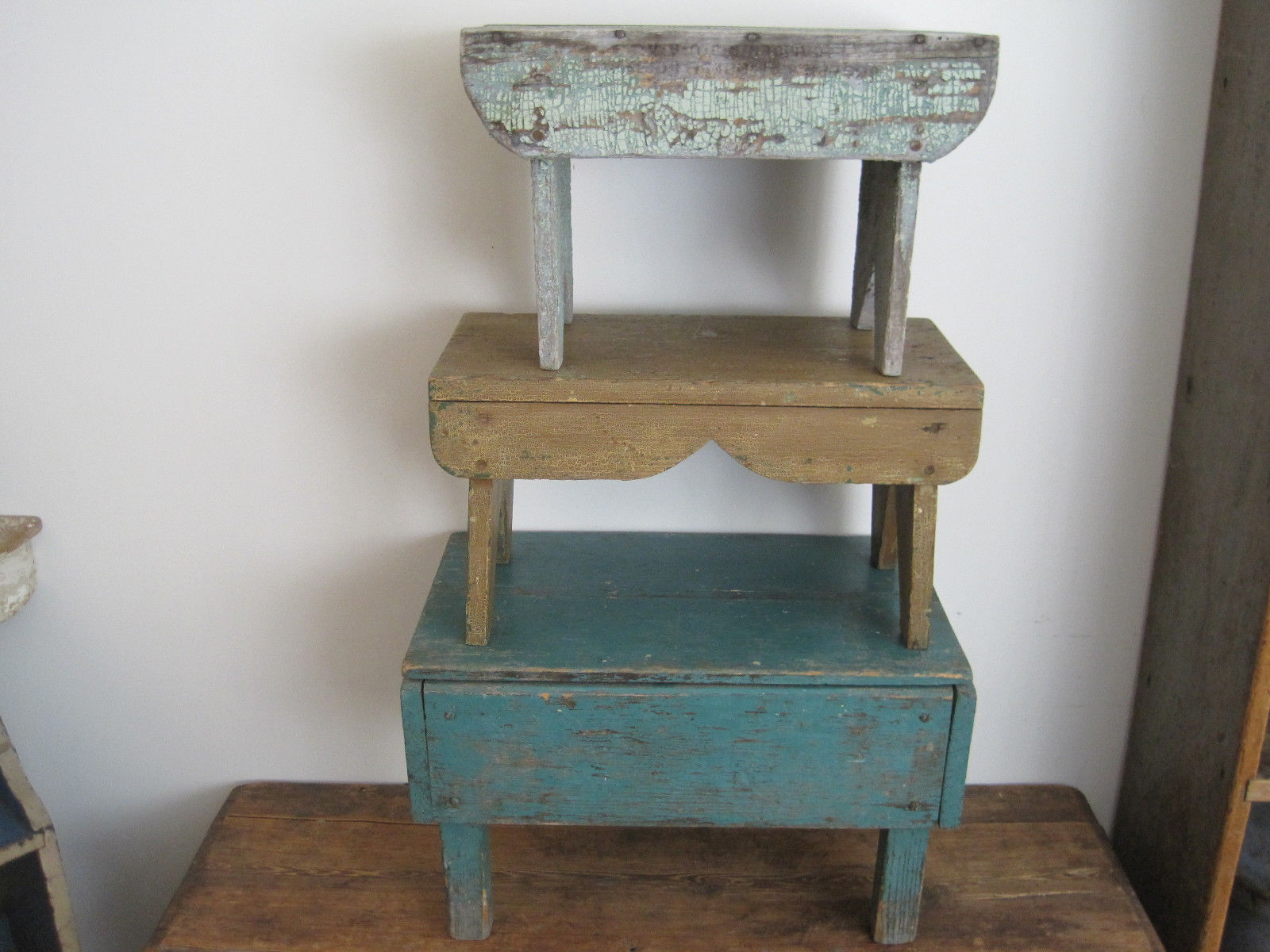Title (ebay affiliate link): Old Primitive Chippy Green Paint Wood Stool American Farm Country Find AAFA