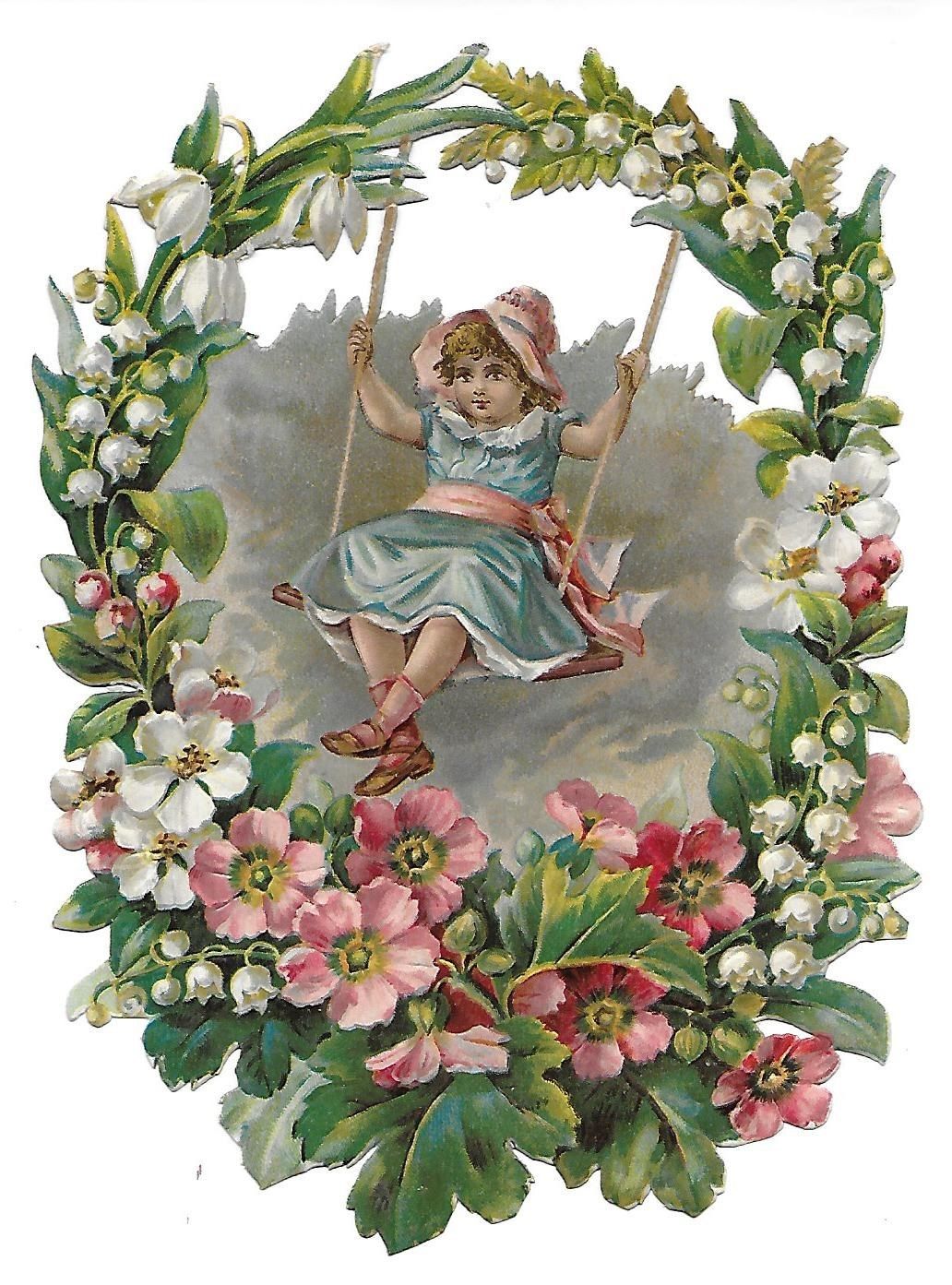 Antique Victorian Die Cut Scrap. Little Girl on a swing in spring flowers. 1880