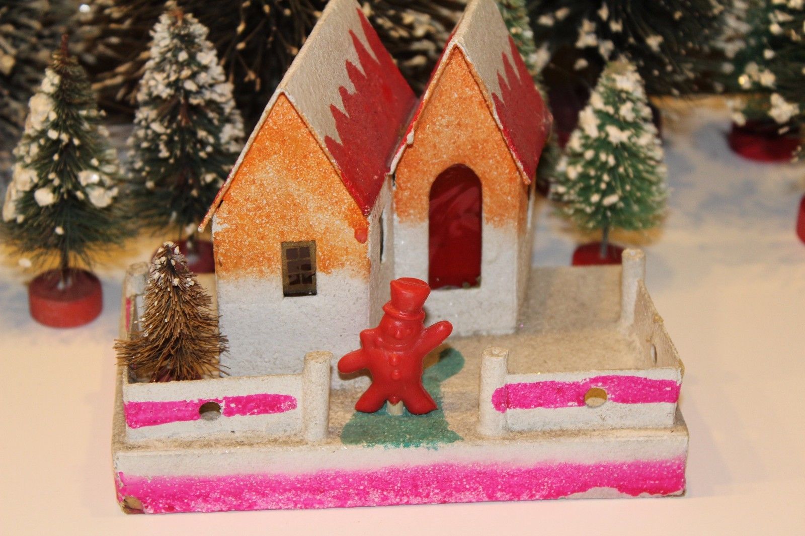 Title (ebay affiliate link): Super Vintage Cardboard Christmas Putz Mica House Snowman & Bottle Brush Tree
