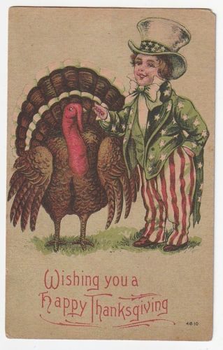 Title (ebay affiliate link): Boy Dressed as Uncle Sam Standing Next to Tom Turkey~Thanksgiving Postcard~#4810