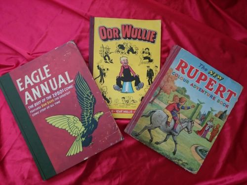 Title (ebay affiliate link): Vintage childrens books x 3. Rupert Bear, Eagle Annual and Oor Wullie.