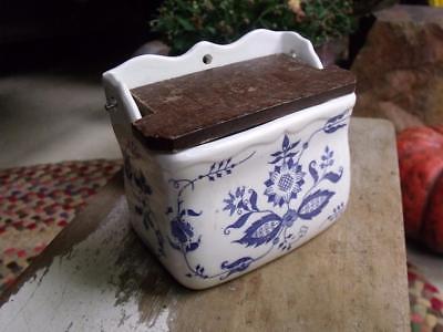 Vintage Blue & White Ceramic Salt Box Primitive Wood Hinged Lid Blue Onion Des ?