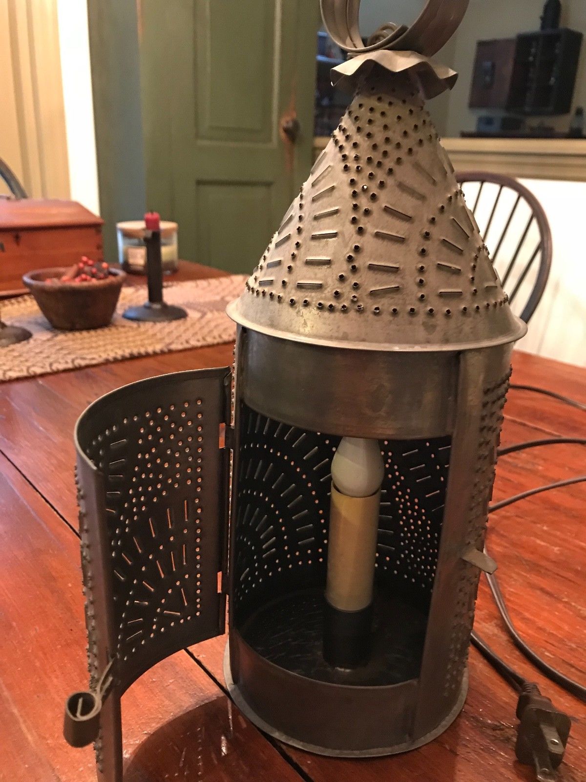 Title (ebay affiliate link): ANTIQUE PRIMITIVE REPRODUCTION PUNCHED TIN ELECTRIC LANTERN