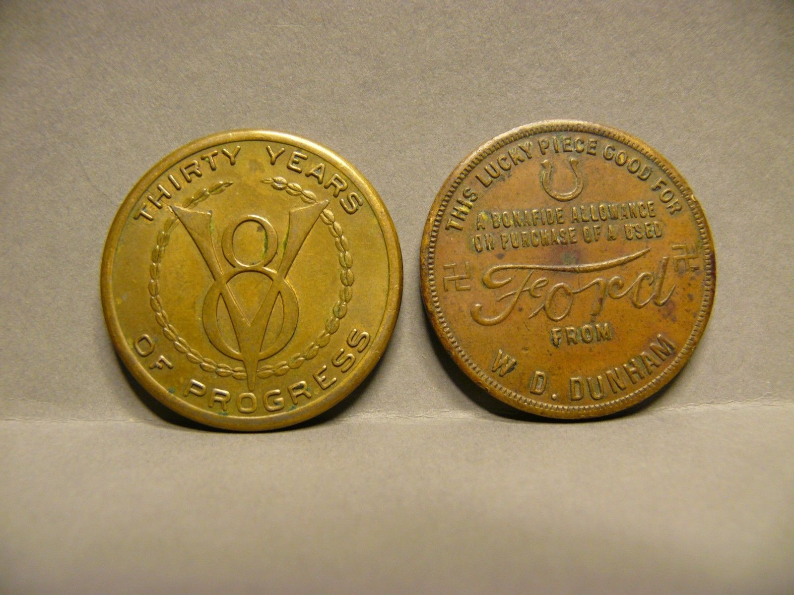 Title (ebay affiliate link): TWO Antique FORD V8 MOTOR Auto Tokens 1903-1933 Dunham Dealership Los Angeles CA