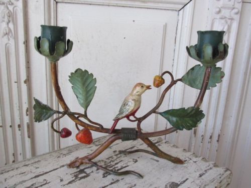 SWEETEST Little Vintage Candle Holder BIRD & STRAWBERRIES Italian TOLE Patina!