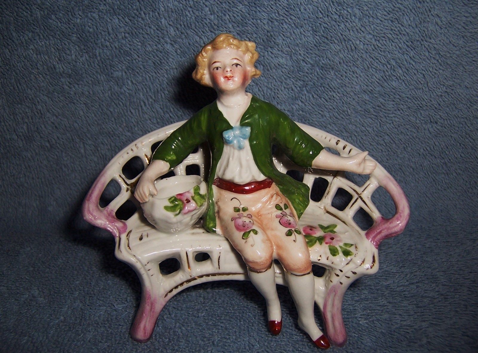 Title (ebay affiliate link): Antique German Dollhouse Size Porcelain Bisque Boy Doll Figurine on Bench~Lovely