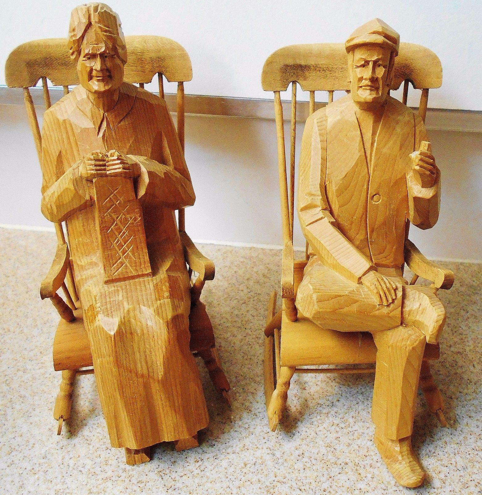 Vintage Wood Hand Carved Old Man & Woman In Rocking Chairs French