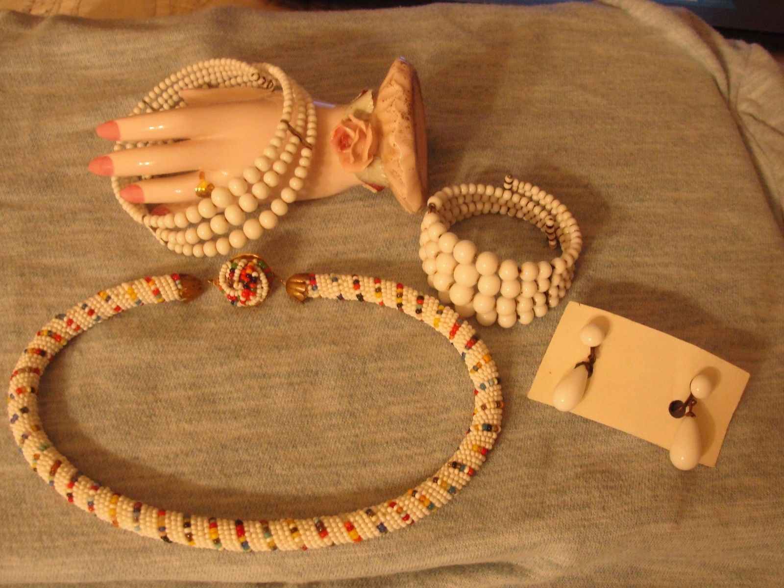 Title (ebay affiliate link): VINTAGE LOT OF 4 WHITE MILK GLASS BEADED NECKLACES BRACELET AND EARRINGS