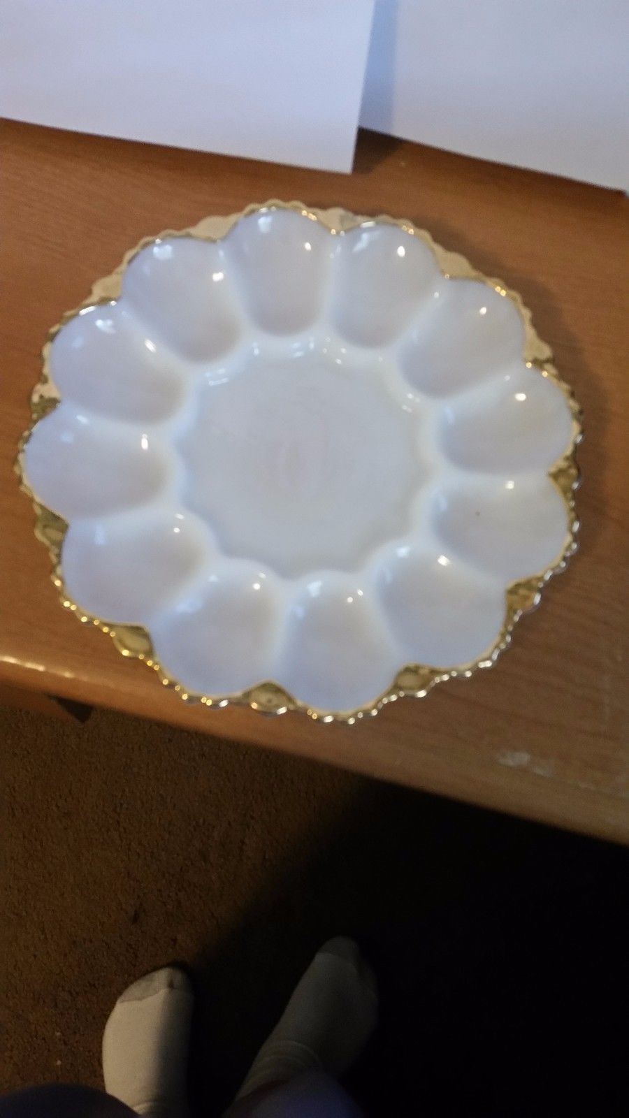 Vintage Devil Egg Plate/Platter White Milk Glass with Gold Trim scallop rim