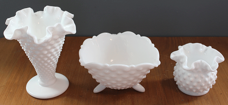 Three! VINTAGE Milk Glass PIECES Vases HOBNAIL Bowl WHITE