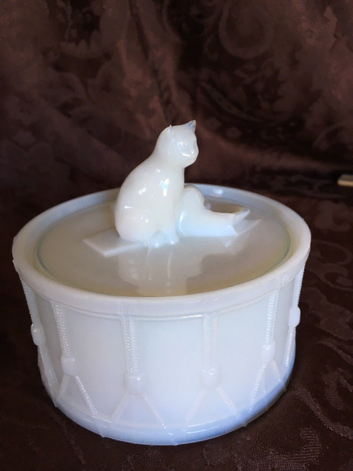 Title (ebay affiliate link): Portieux White Milk Glass Covered Dish, Cat On A Snare Drum, marked