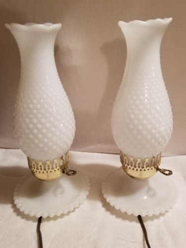 Title (ebay affiliate link): Vintage Pair of White Milk Glass Lamps Lantern Hobnail Hurricane