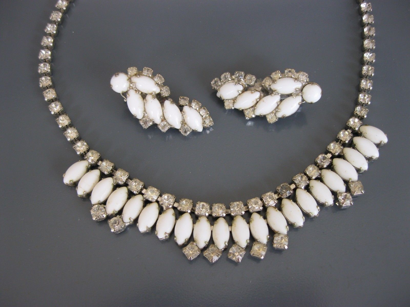 Title (ebay affiliate link): VINTAGE MILK GLASS RHINESTONE DEMI PARURE SET NECKLACE CLIP ON EARRINGS