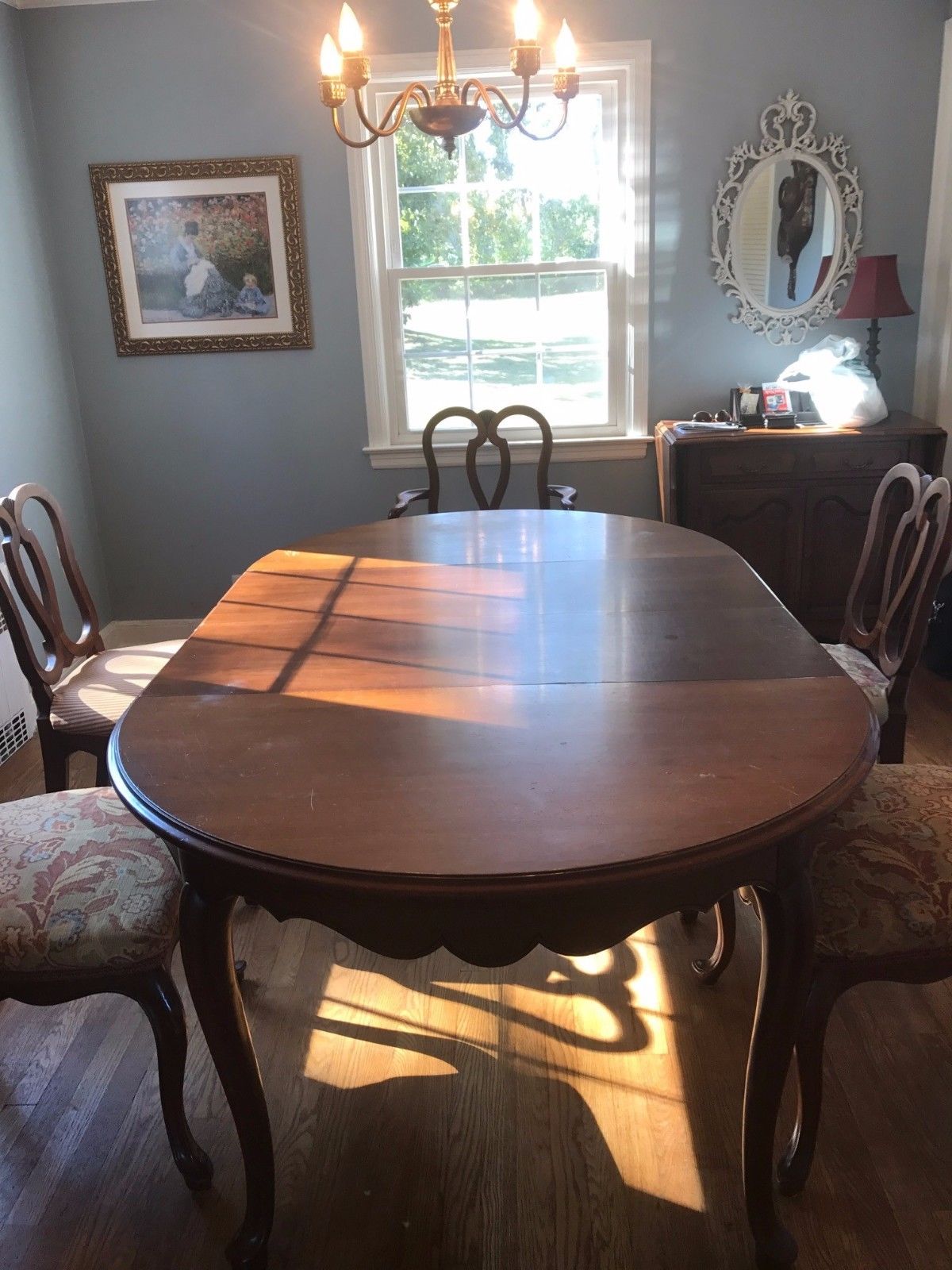 Title (ebay affiliate link): Wood dining room set; table with leaf, 5 chairs, hutch and buffet/server