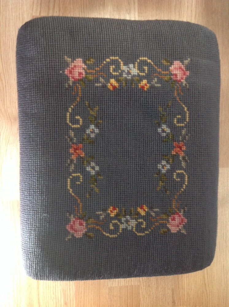 Title (ebay affiliate link): Antique Wood FOOT STOOL Old Embroidered Gray Rose Floral