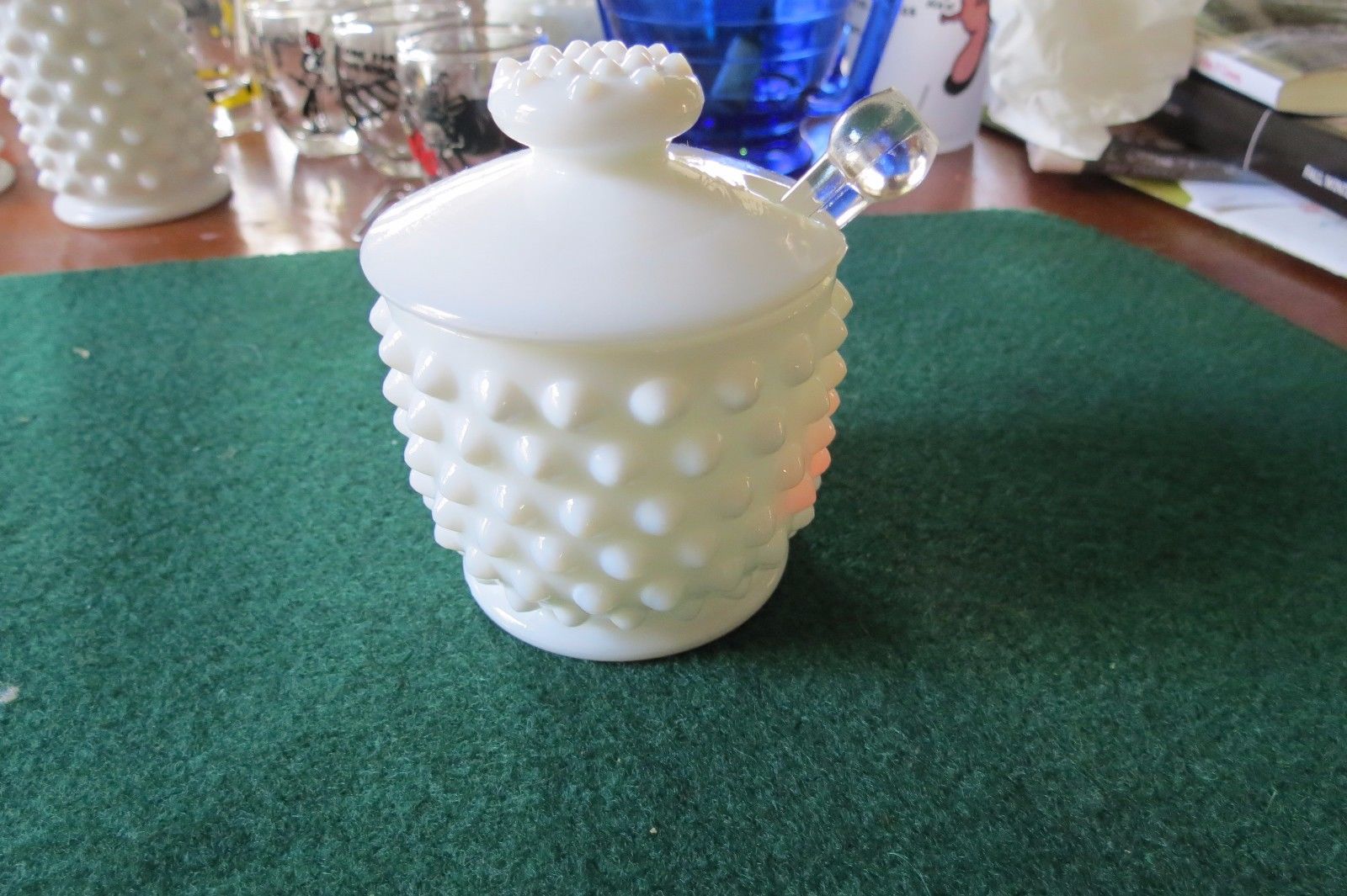Title (ebay affiliate link): Vintage Milk Glass Hobnail Fenton Condiment Mustard Jam Jar with Lid & Spreader