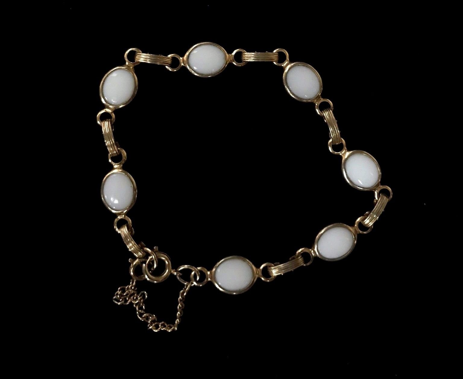 Vintage Gold Tone White Milk Glass Link Bracelet 8" A300