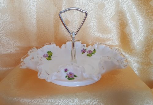 Title (ebay affiliate link): Fenton Milk Glass Silvercrest Ruffled Bowl Candy Dish Bowl with Violet Flowers