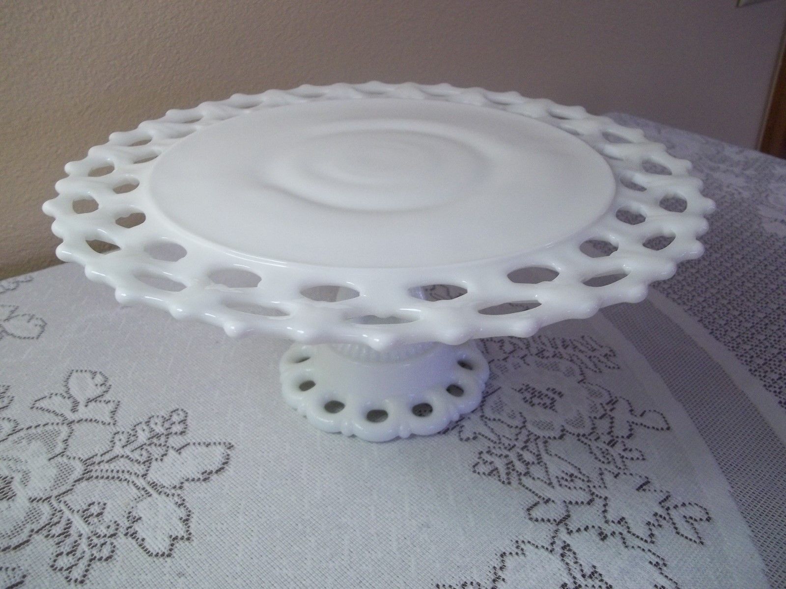Title (ebay affiliate link): Vintage Westmoreland Doric Open Lace Edge Milk Glass Cake Stand Pedestal Plate