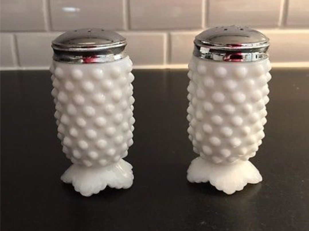 Title (ebay affiliate link): Vintage Hobnail Milk Glass Salt and Pepper Shakers pre-marked
