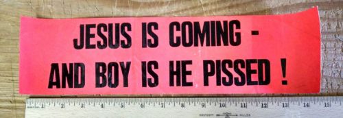 Title (ebay affiliate link): Vintage bumper sticker JESUS IS COMING AND BOY IS HE PISSED unused.