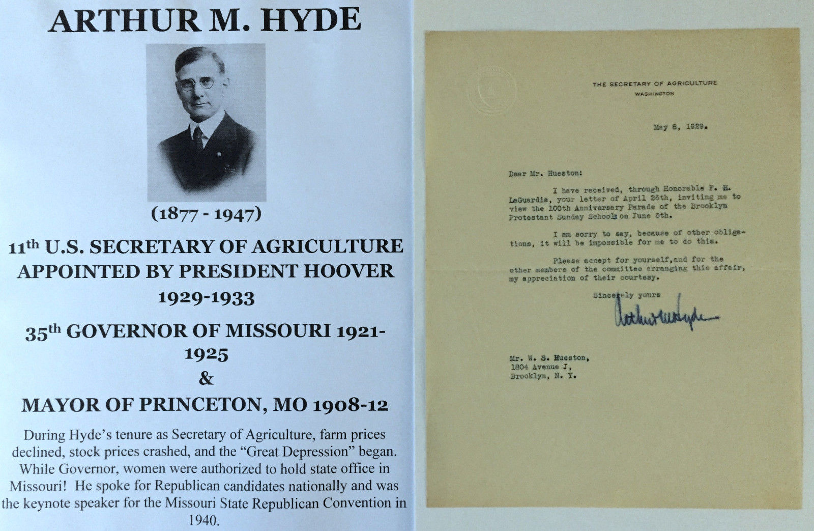 Title (ebay affiliate link): PRESIDENT HOOVER SECRETARY AGRICULTURE GOVERNOR MISSOURI LETTER SIGNED 1929 VF !