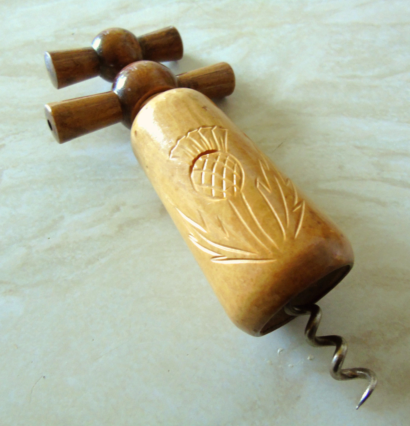 Title (ebay affiliate link): Vintage Two Tone Wooden Double Twist Corkscrew with Scottish Thistle Emblem