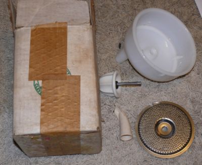 COMPLETE VINTAGE MILK GLASS JUICER ATTACHMENT W/ BOX