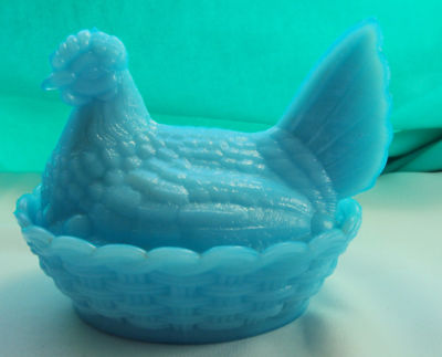 L G Wright Blue Milkglass Hen on nest Split Tail