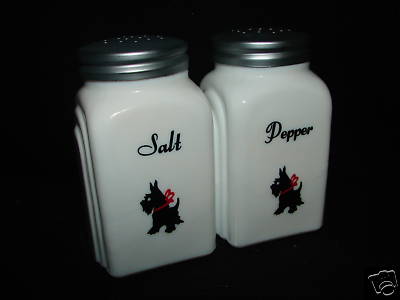 MILK GLASS ROMAN ARCH SCOTTY SALT & PEPPER SHAKERS